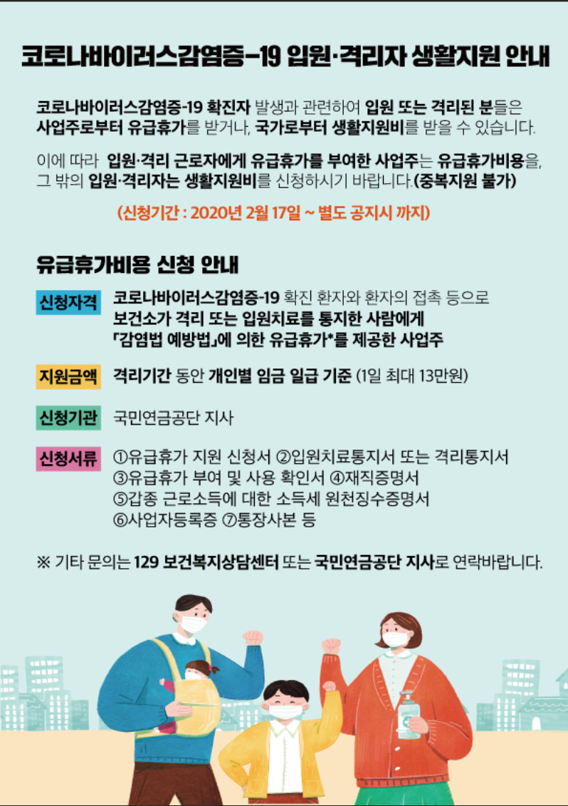 코로나바이러스 감염증으로 입원 격리를 하게 되면 국가로부터 생활지원비를 받을 수 있는데요 이것을 자가격리 지원금이 아닌 유급휴가비용과 생활지원비로 나누어 자가격리 지원금을 받을 수 있습니다.