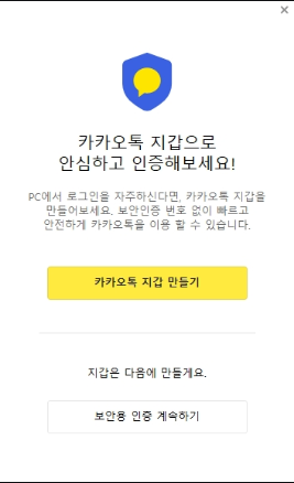 자신의 카카오 계정 이메일 또는 전화번호를 입력 뒤 비밀번호를 입력하여 로그인을 하면 본인인증 화면으로 바뀝니다. 본인인증에는 간단한 카카오톡 지갑 만들기를 통한 보안 인증이 있고 내 PC 인증받기나 공공장소 또는 PC방에서 사용할 때 필요한 1회용 인증받기 등을 상황에 맞게 선택하여 인증을 하도록 합니다.