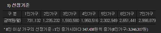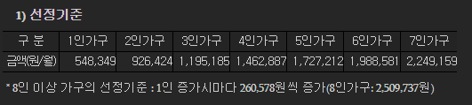 생계급여의 선정기준 1인 가구는 548,349, 2인 가구는 926,424, 3인 가구는 1,195,185, 4인 가구 1,462,887, 5인 가구 1,727,212, 6인 가구 1,988,581, 7인 가구 2,249,159, 8인 가구 2,509,737이며 8인 이상 가구의 선정기준은 1인 증가마다 260,578원씩 증가합니다.