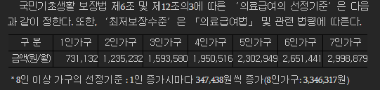 의료급여의 선정기준 및 최저보장 수준은 1인 가구는 731,132, 2인 가구 1,235,232, 3인 가구 1,593,580, 4인 가구 1,950,516, 5인 가구 2,302,949, 6인 가구 2,651,441, 7인 가구 2,998,879, 8인 가구 3,346,317원이며 8인 이상 가구의 선정기준은 1인 증가 시 347,438원씩 증가합니다.