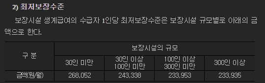 보장시설 최저보장수준은 역시 수급자 1인당 규모별로 상이합니다. 30인 미만은 268,052, 30인 이상 100인 미만 243,338, 100인 이상 300인 미만 233,953, 300인 이상 233,935입니다.