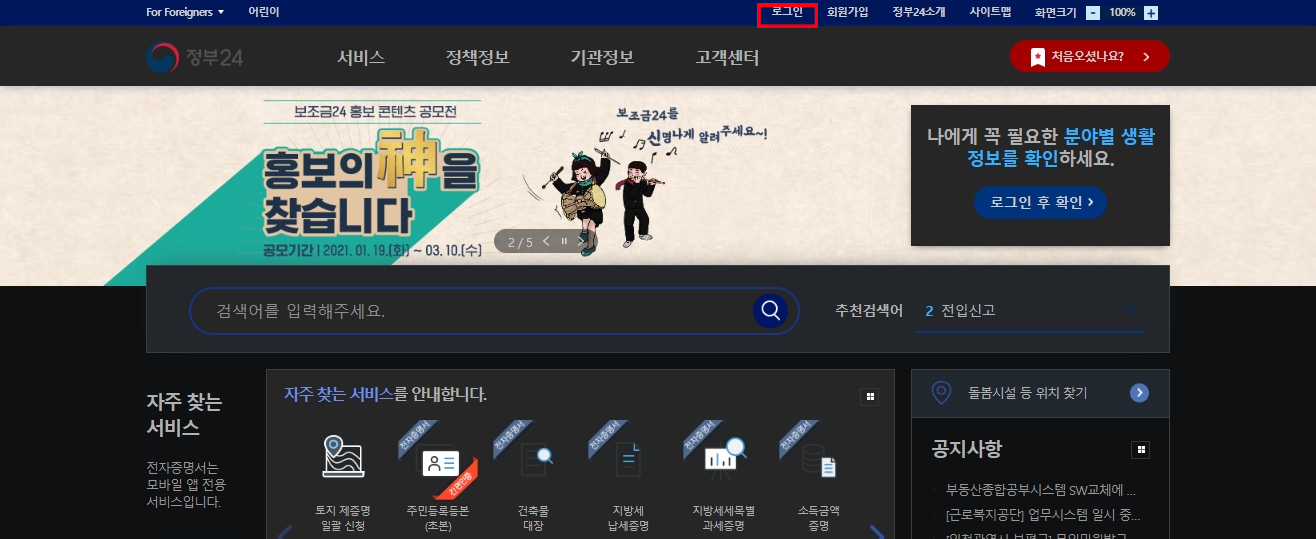 메인 페이지 상단에서 로그인을 선택해주세요. 회원이 아니신 분들도 이제는 공동 인증서로 공인인증서를 대체하여 이용이 가능하기 때문에 회원가입을 굳이 하실 필요는 없습니다.