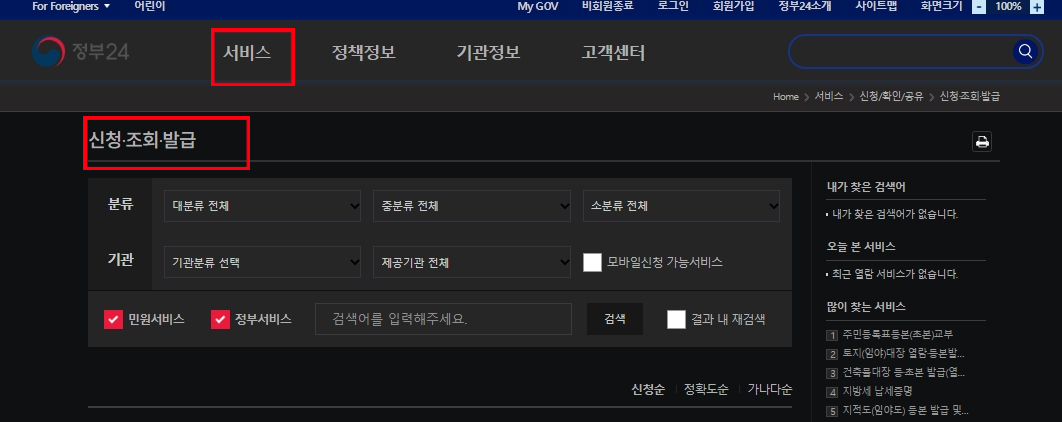 로그인을 마무리하였으면 서비스에서 신청/조회/발급을 선택해주세요.