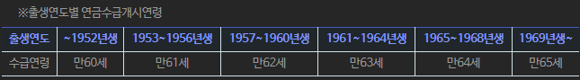 출생연도별 연금수급개시연령표를 보겠습니다.